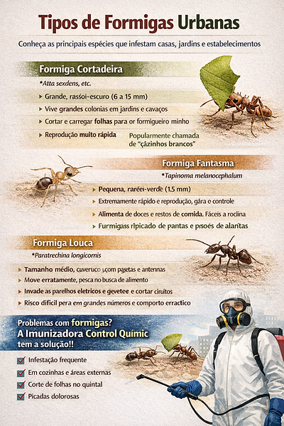 Formiga de Fogo (Lava-pés): Conhecida pela picada dolorida; costuma fazer ninhos em jardins ou áreas externas que dão acesso ao interior.